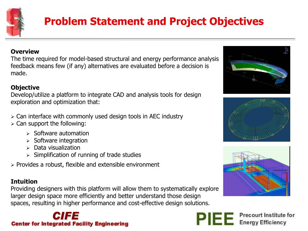 Problem Statement and Project Objectives • Overview • The time required for model-based structural and energy performance analysis feedback means few (if any) alternatives are evaluated before a decision is made. • Objective • Develop/utilize a platform to integrate CAD and analysis tools for design exploration and optimization that: • Can interface with commonly used design tools in AEC industry • Can support the following: • Software automation • Software integration • Data visualization • Simplification of running of trade studies • Provides a robust, flexible and extensible environment • Intuition • Providing designers with this platform will allow them to systematically explore larger design space more efficiently and better understand those design spaces, resulting in higher performance and cost-effective design solutions.