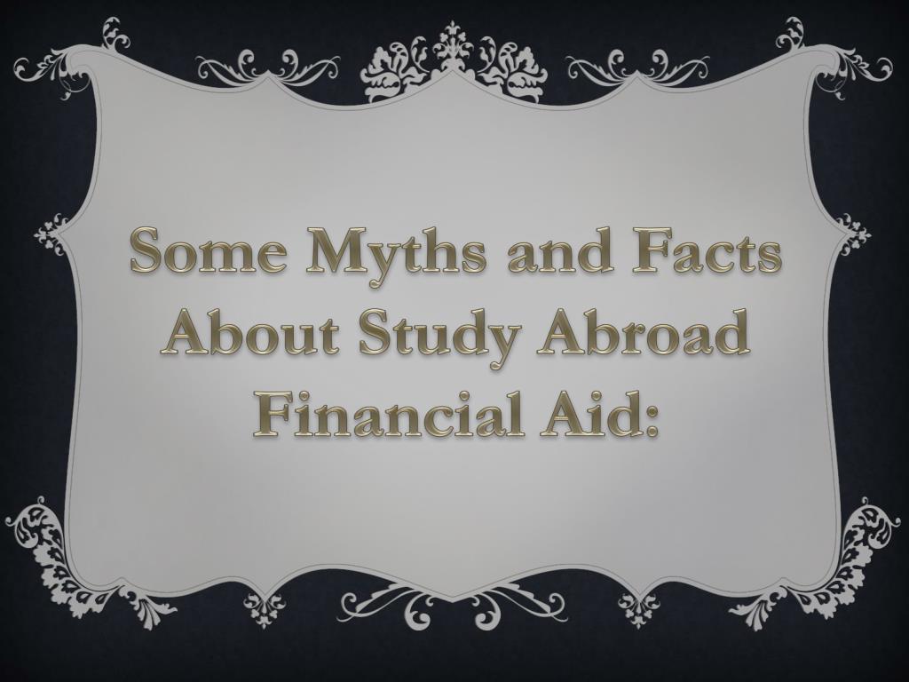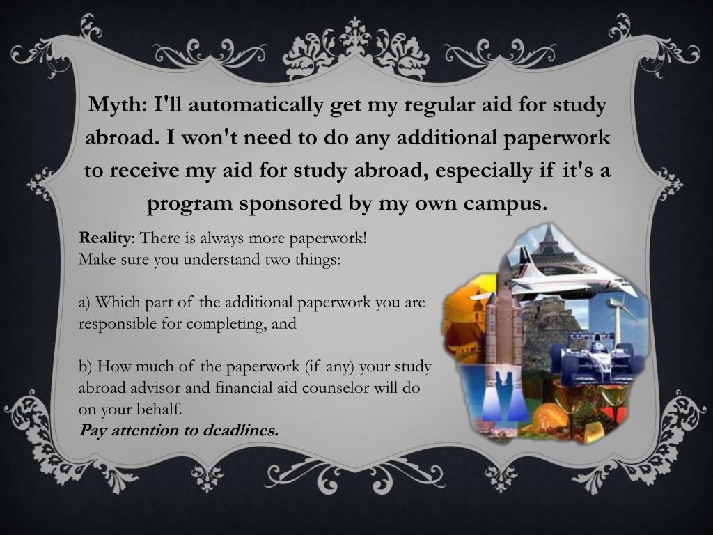 Myth: I'll automatically get my regular aid for study abroad. I won't need to do any additional paperwork to receive my aid for study abroad, especially if it's a program sponsored by my own campus. Reality: There is always more paperwork!Make sure you understand two things:a) Which part of the additional paperwork you are responsible for completing, andb) How much of the paperwork (if any) your study abroad advisor and financial aid counselor will do on your behalf.Pay attention to deadlines.