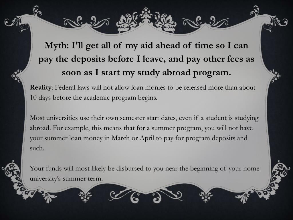 Myth: I'll get all of my aid ahead of time so I can pay the deposits before I leave, and pay other fees as soon as I start my study abroad program. Reality: Federal laws will not allow loan monies to be released more than about 10 days before the academic program begins. Most universities use their own semester start dates, even if a student is studying abroad. For example, this means that for a summer program, you will not have your summer loan money in March or April to pay for program deposits and such. Your funds will most likely be disbursed to you near the beginning of your home university’s summer term.