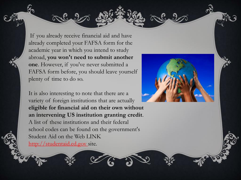 If you already receive financial aid and have already completed your FAFSA form for the academic year in which you intend to study abroad, you won't need to submit another one. However, if you've never submitted a FAFSA form before, you should leave yourself plenty of time to do so. It is also interesting to note that there are a variety of foreign institutions that are actually eligible for financial aid on their own without an intervening US institution granting credit. A list of these institutions and their federal school codes can be found on the government's Student Aid on the Web LINK http://studentaid.ed.gov site.