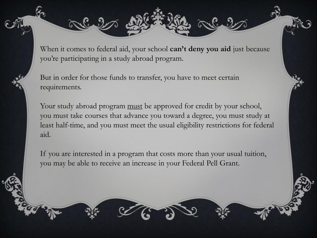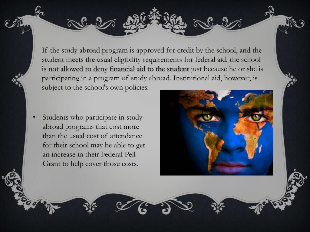 If the study abroad program is approved for credit by the school, and the student meets the usual eligibility requirements for federal aid, the school is not allowed to deny financial aid to the student just because he or she is participating in a program of study abroad. Institutional aid, however, is subject to the school's own policies. • Students who participate in study-abroad programs that cost more than the usual cost of attendance for their school may be able to get an increase in their Federal Pell Grant to help cover those costs.
