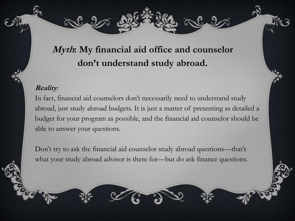 Myth: My financial aid office and counselor don’t understand study abroad. Reality: In fact, financial aid counselors don’t necessarily need to understand study abroad, just study abroad budgets. It is just a matter of presenting as detailed a budget for your program as possible, and the financial aid counselor should be able to answer your questions. Don’t try to ask the financial aid counselor study abroad questions—that’s what your study abroad advisor is there for—but do ask finance questions.
