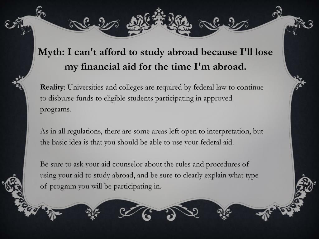 Myth: I can't afford to study abroad because I'll lose my financial aid for the time I'm abroad. Reality: Universities and colleges are required by federal law to continue to disburse funds to eligible students participating in approved programs. As in all regulations, there are some areas left open to interpretation, but the basic idea is that you should be able to use your federal aid. Be sure to ask your aid counselor about the rules and procedures of using your aid to study abroad, and be sure to clearly explain what type of program you will be participating in.