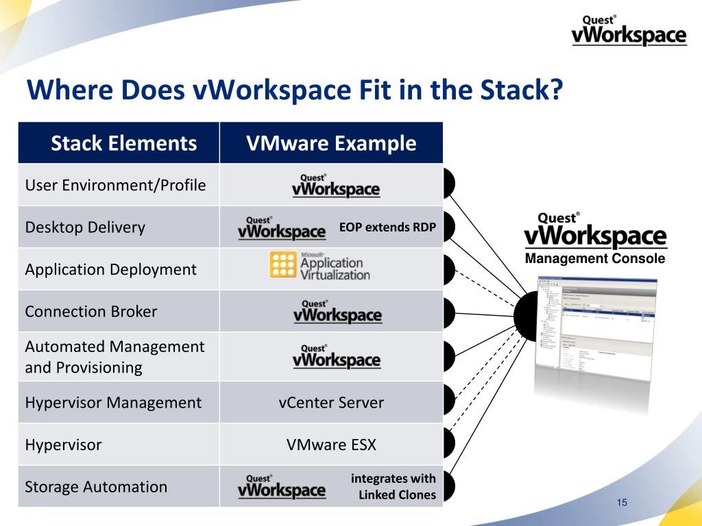 Desktop Virtualization Challenge: Increases in TCO with Production Deployment Solution: Quest vWorkspace More Users and Apps Full-Scale Deployment • Contains TCO • Avoids increases in IT staff • Effective Mgmt. is the key • Costs do not shift to Data Ctr. More Users and Apps Initial Deployment POC WITH Quest vWorkspace • Reduces the Complexity and IT Effort Required to Manage the Virtual Desktop Environment