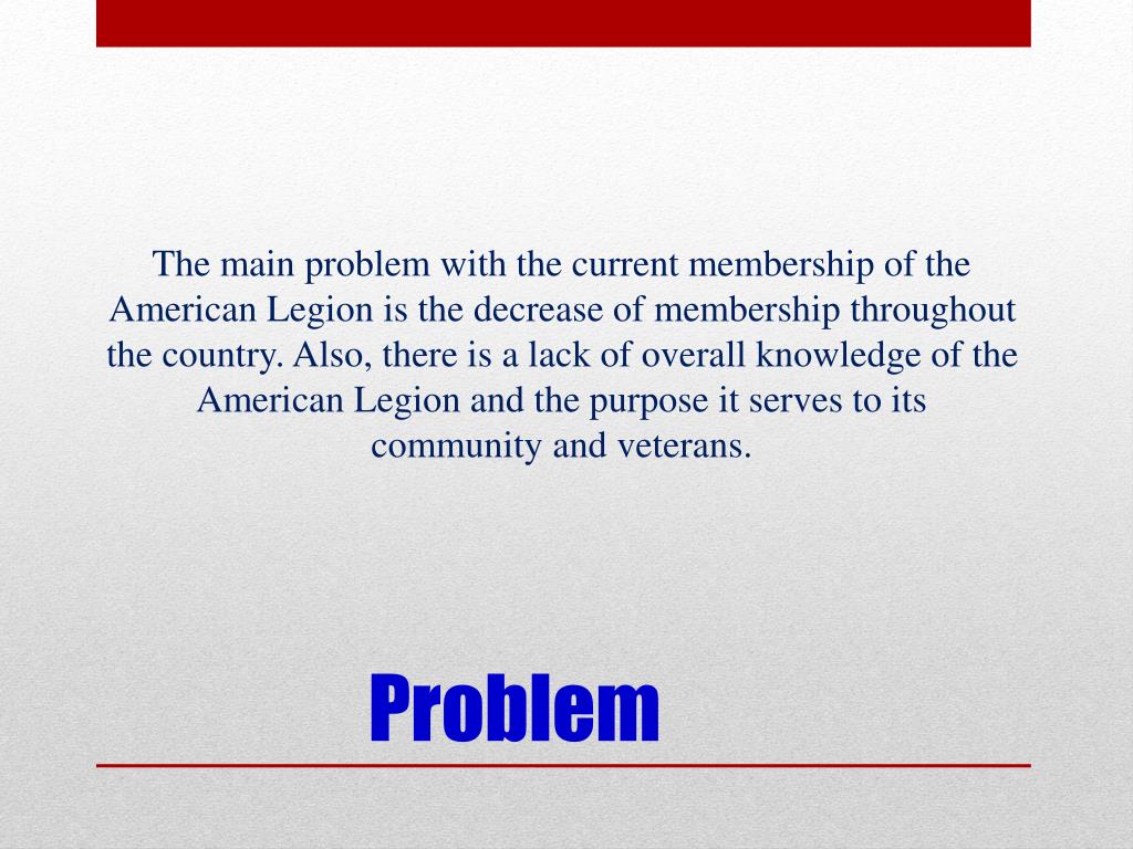 The main problem with the current membership of the American Legion is the decrease of membership throughout the country. Also, there is a lack of overall knowledge of the American Legion and the purpose it serves to its community and veterans. Problem