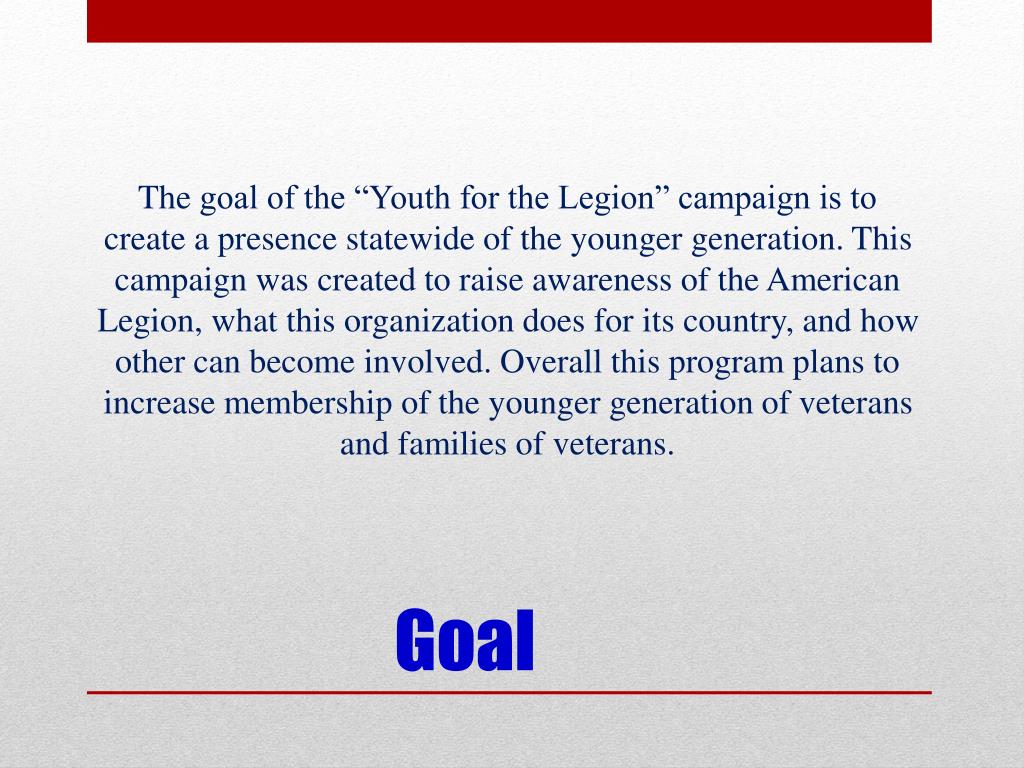 The goal of the “Youth for the Legion” campaign is to create a presence statewide of the younger generation. This campaign was created to raise awareness of the American Legion, what this organization does for its country, and how other can become involved. Overall this program plans to increase membership of the younger generation of veterans and families of veterans. Goal