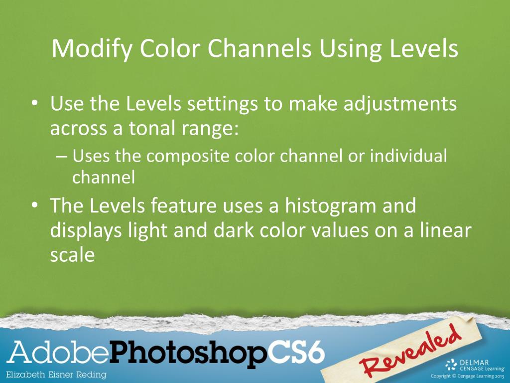 Modify Color Channels Using Levels • Use the Levels settings to make adjustments across a tonal range: • Uses the composite color channel or individual channel • The Levels feature uses a histogram and displays light and dark color values on a linear scale