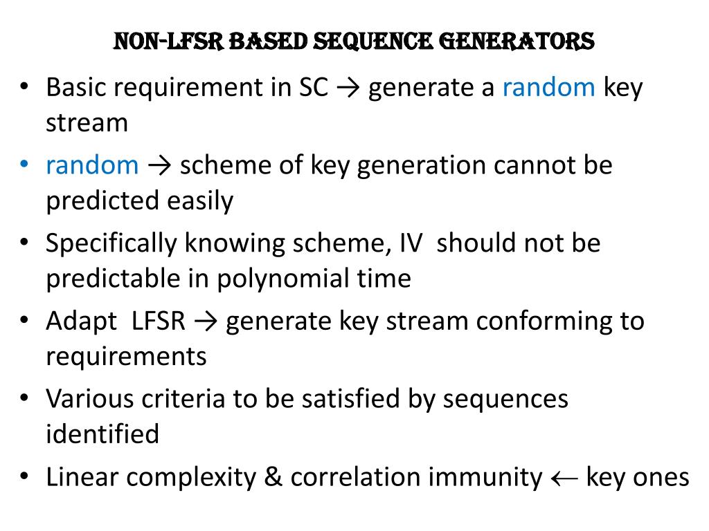 Non-LFSR based sequence generators • Basic requirement in SC → generate a random key stream • random → scheme of key generation cannot be predicted easily • Specifically knowing scheme, IV should not be predictable in polynomial time • Adapt LFSR → generate key stream conforming to requirements • Various criteria to be satisfied by sequences identified • Linear complexity & correlation immunity key ones