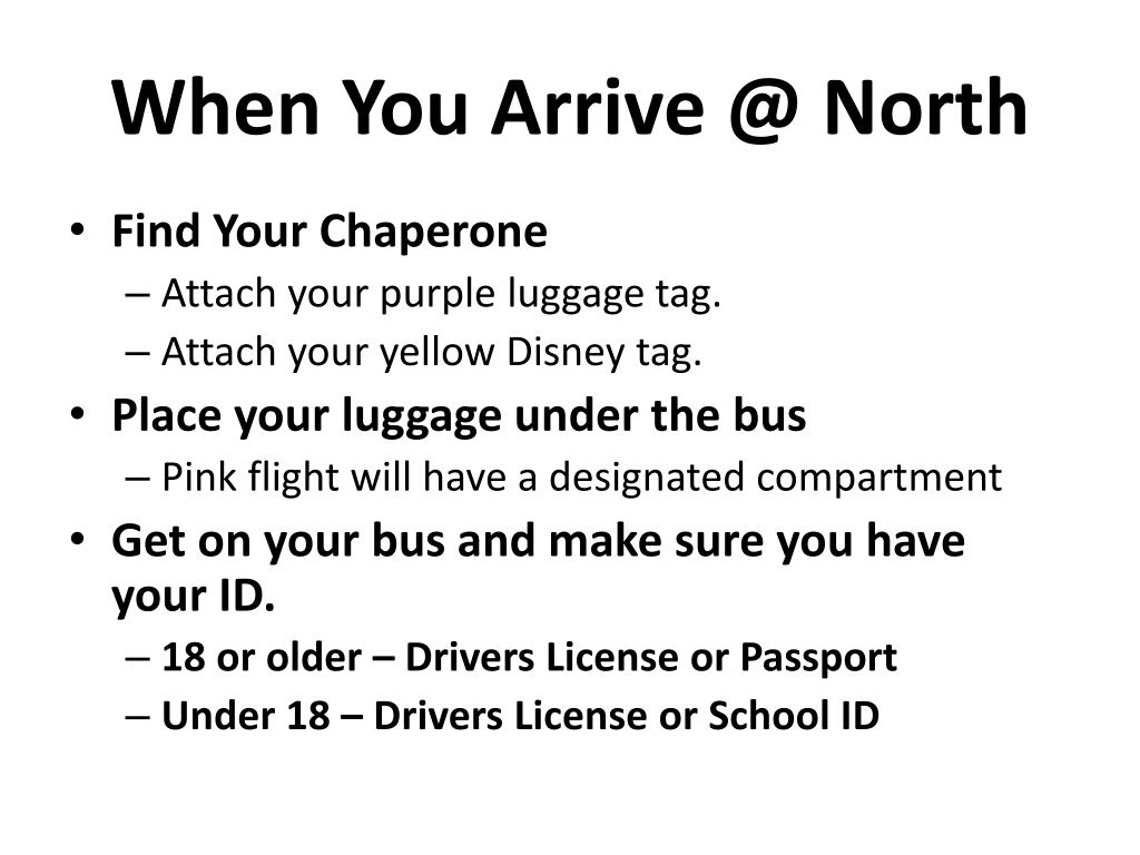 When You Arrive @ North • Find Your Chaperone • Attach your purple luggage tag. • Attach your yellow Disney tag. • Place your luggage under the bus • Pink flight will have a designated compartment • Get on your bus and make sure you have your ID. • 18 or older – Drivers License or Passport • Under 18 – Drivers License or School ID