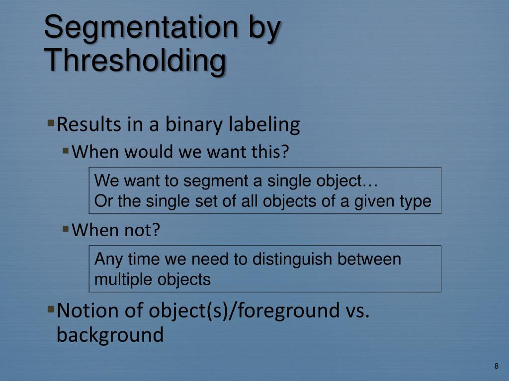 Segmentation by Thresholding • Results in a binary labeling • When would we want this? • When not? • Notion of object(s)/foreground vs. background We want to segment a single object… Or the single set of all objects of a given type Any time we need to distinguish between multiple objects