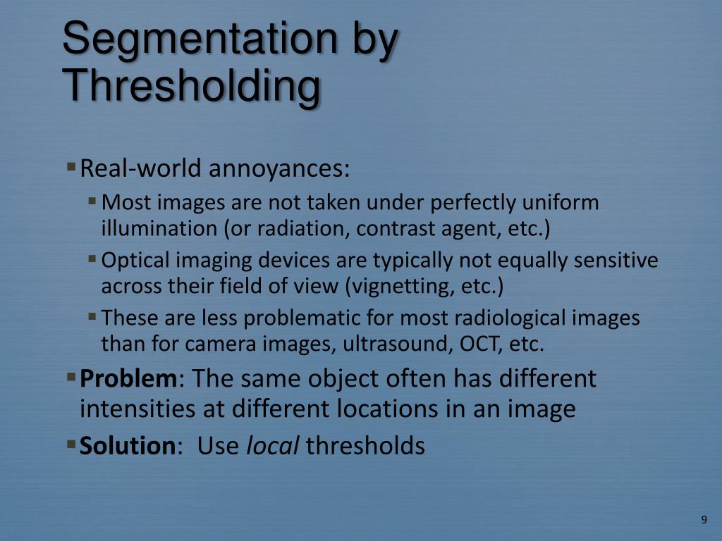 Segmentation by Thresholding • Real-world annoyances: • Most images are not taken under perfectly uniform illumination (or radiation, contrast agent, etc.) • Optical imaging devices are typically not equally sensitive across their field of view (vignetting, etc.) • These are less problematic for most radiological images than for camera images, ultrasound, OCT, etc. • Problem: The same object often has different intensities at different locations in an image • Solution: Use local thresholds