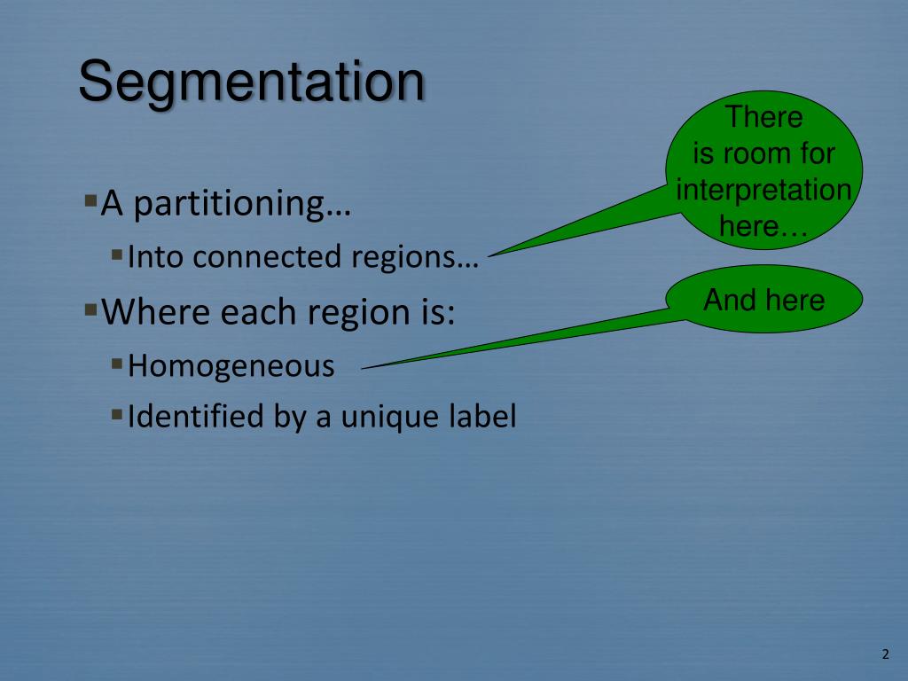 Segmentation There is room for interpretation here… • A partitioning… • Into connected regions… • Where each region is: • Homogeneous • Identified by a unique label And here
