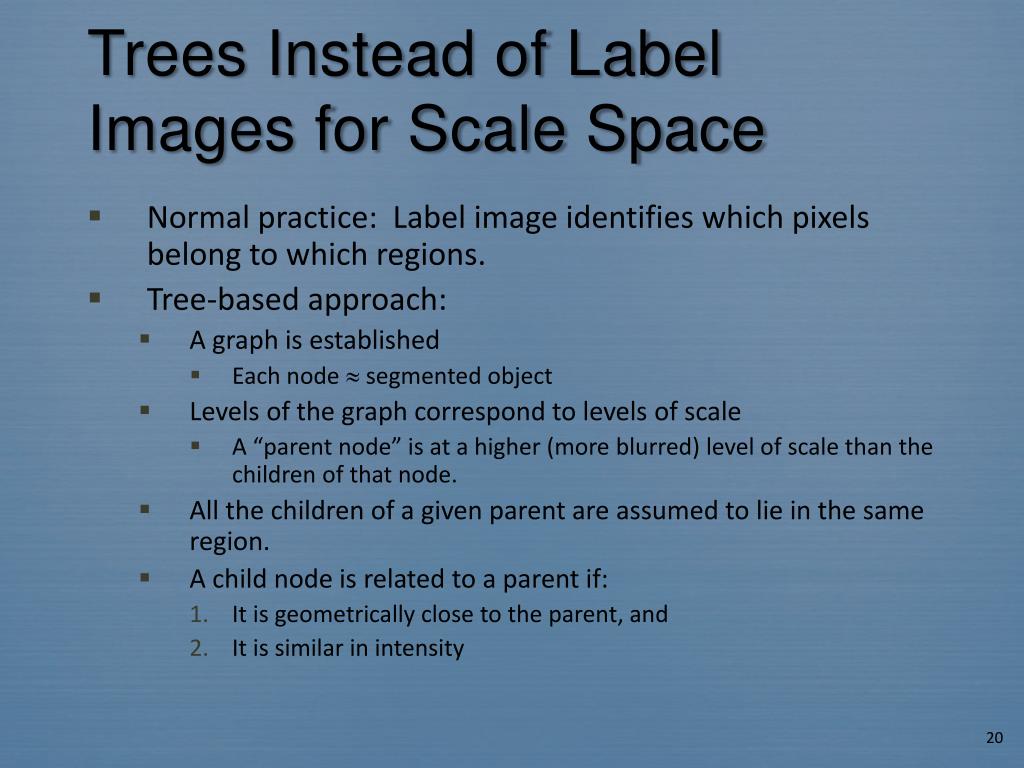 Trees Instead of Label Images for Scale Space • Normal practice: Label image identifies which pixels belong to which regions. • Tree-based approach: • A graph is established • Each node segmented object • Levels of the graph correspond to levels of scale • A “parent node” is at a higher (more blurred) level of scale than the children of that node. • All the children of a given parent are assumed to lie in the same region. • A child node is related to a parent if: • It is geometrically close to the parent, and • It is similar in intensity