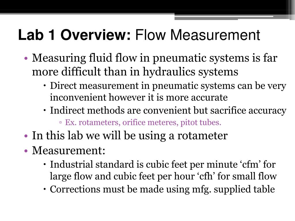 Lab 1 Overview: Flow Measurement Measuring fluid flow in pneumatic systems is far more difficult than in hydraulics systems Direct measurement in pneumatic systems can be very inconvenient however it is more accurate Indirect methods are convenient but sacrifice accuracy Ex. rotameters, orifice meteres, pitot tubes. In this lab we will be using a rotameter Measurement: Industrial standard is cubic feet per minute ‘cfm’ for large flow and cubic feet per hour ‘cfh’ for small flow Corrections must be made using mfg. supplied table
