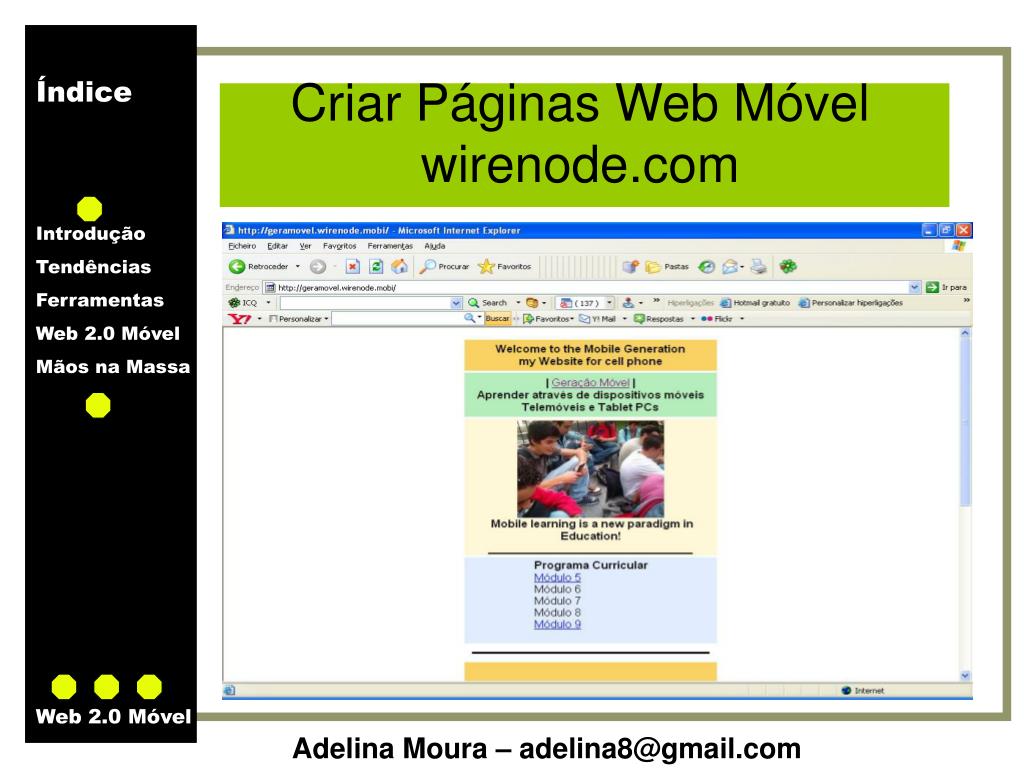 Editores de páginas para telemóvel • Wirenode – Geração móvel • MobiSiteGalore • Winksite – GMóvel Microblogue • Twitter - geramovel • Edmodo Copiar e partilhar • Qipit – copiar documentos, manuscritos, notas com a câmara do telemóvel armazená-las e partilhá-las. Marcador • Mobilicio.us – Marcador de favoritos