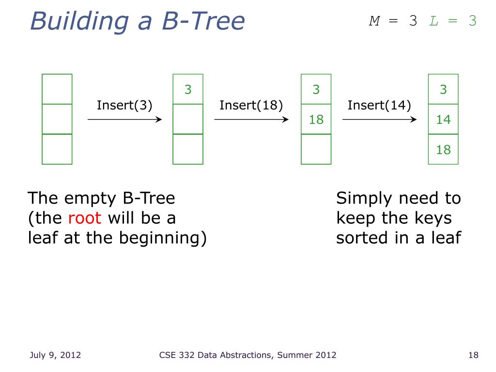 Building a B-Tree M = 3 L = 3 3 3 3 Insert(3) Insert(18) Insert(14) 18 14 18 The empty B-Tree (the rootwill be a leaf at the beginning) Simply need to keep the keys sorted in a leaf CSE 332 Data Abstractions, Summer 2012