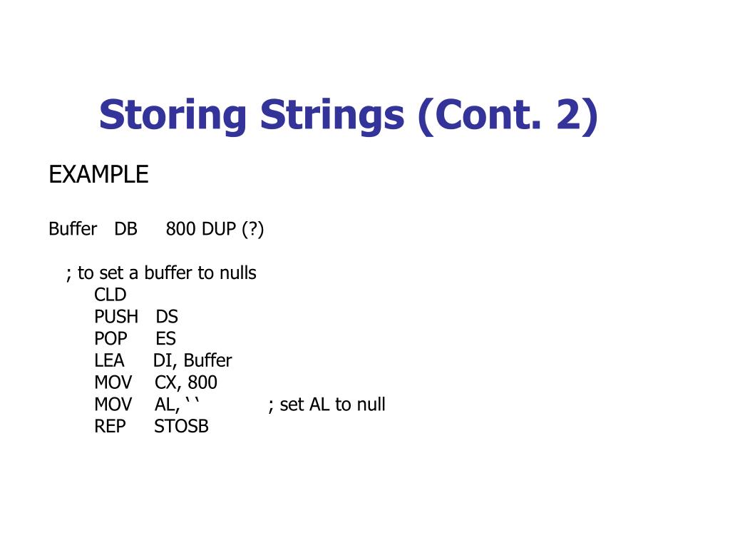 Storing Strings (Cont. 2) EXAMPLE Buffer DB 800 DUP (?) ; to set a buffer to nulls CLD PUSH DS POP ES LEA DI, Buffer MOV CX, 800 MOV AL, ‘ ‘ ; set AL to null REP STOSB