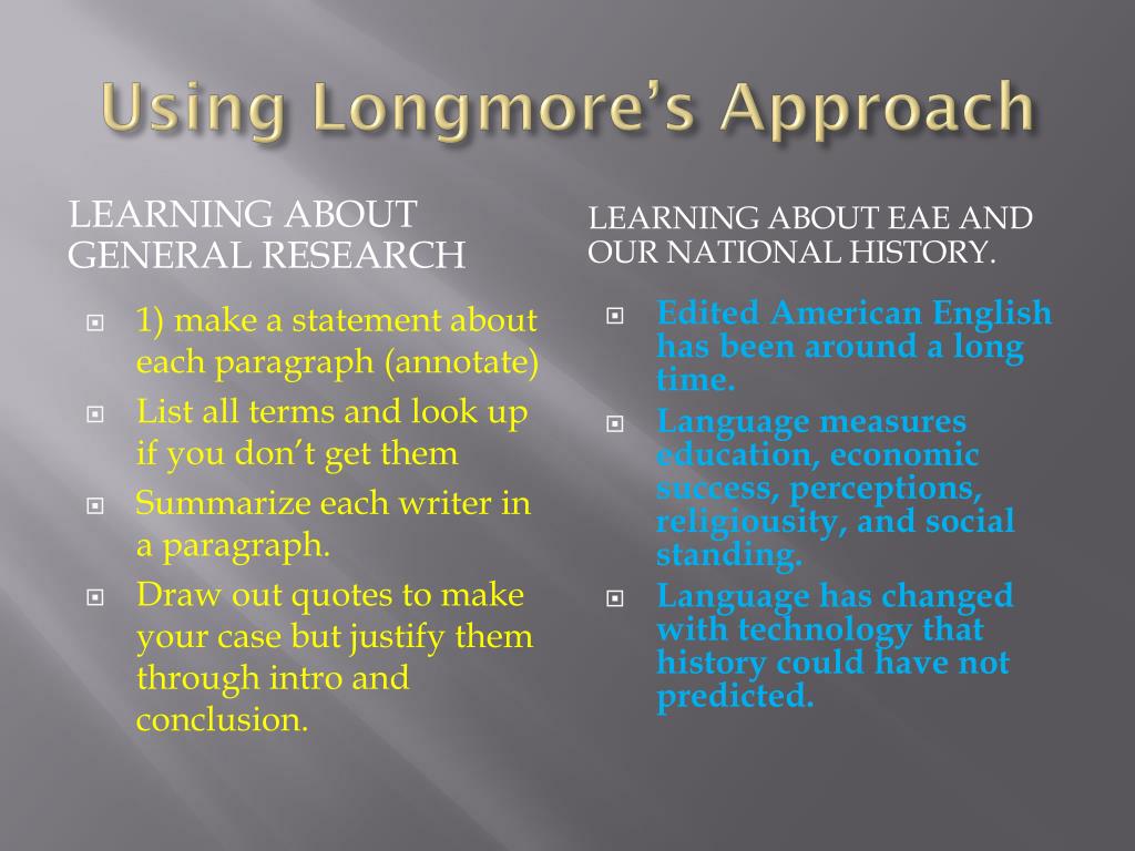 Using Longmore’s Approach Learning about general Research Learning about EAE and our national History. • 1) make a statement about each paragraph (annotate) • List all terms and look up if you don’t get them • Summarize each writer in a paragraph. • Draw out quotes to make your case but justify them through intro and conclusion. • Edited American English has been around a long time. • Language measures education, economic success, perceptions, religiousity, and social standing. • Language has changed with technology that history could have not predicted.