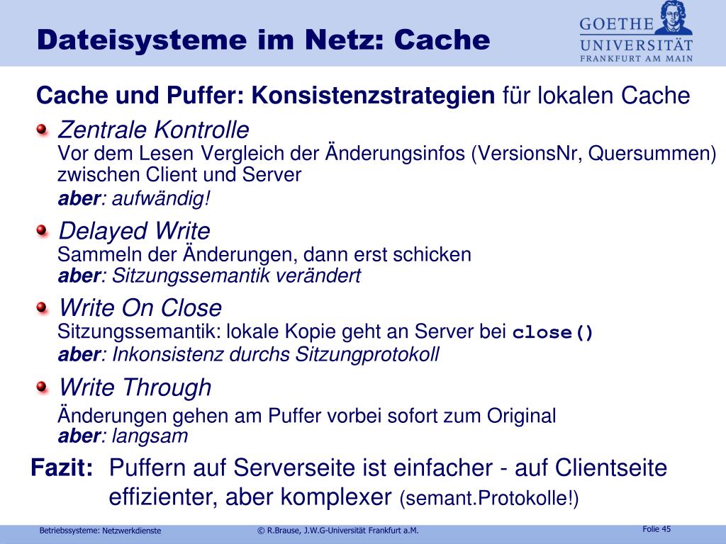 Dateisysteme im Netz: Cache B A A, B lesen A schreibt B schreibt Datenobjekt Problem: Konsistenz der lokalen Cache Puffer A Puffer B ? Objektpuffer Inkonsistenz ! Netzwerkdienste