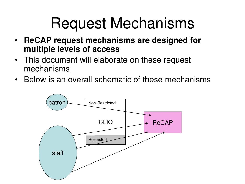 Contents This slide show will cover several topics • Overview request mechanisms • Schematic • User types • Definitions of terms • Detailed information on each mechanism To access the mechanisms use CLIO or access the ReCAP Request Forms website For more information see the Request Mechanism website