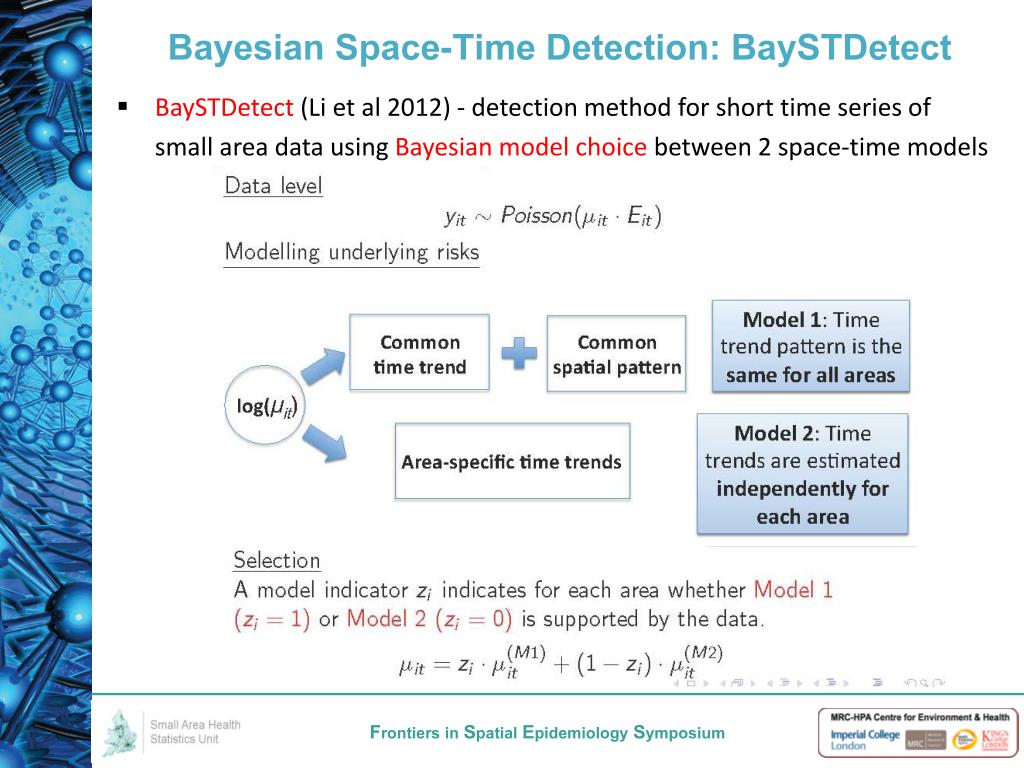 Bayesian Space-Time Detection: BaySTDetect • BaySTDetect(Li et al 2012) - detection method for short time series of small area data using Bayesian model choice between 2 space-time models