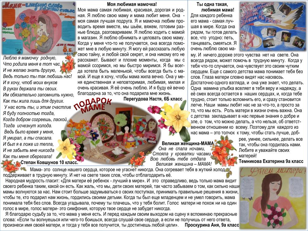 Моя любимая мамочка! Моя мама самая любимая, красивая, дорогая и род-ная. Я люблю свою маму и мама любит меня. Она -моя самая лучшая подруга. Я и мамочка любим про-водить время вместе, мы шьём, вяжем, готовим раз-ные блюда, разговариваем. Я люблю ходить с мамой в магазин. Я люблю обнимать и целовать свою маму. Когда у меня что-то не получается, она всегда помо-жет мне в любую минуту. Я могу ей рассказать любую свою тайну, и любой свой секрет, и она никому его не расскажет. Бывают и плохие моменты, когда мы с мамой ссоримся, но мы быстро миримся. Я бы всег-да хотела быть маленькой, чтобы всегда быть с ма-мой. И еще я хочу, чтобы мама жила вечно. Она у ме-ня единственная и неповторимая, любимая, милая и очень красивая. Я её очень люблю. И я буду ей вечно благодарна за то, что она подарила мне жизнь. Перегудова Настя, 6Б класс Ты одна такая, любимая мама! Для каждого ребенка его мама - самая луч-шая в мире. Когда она рядом, ты готов делать все, что угодно: петь, танцевать, смеяться. Я очень люблю свою ма- му. И ничего дороже этого чувства нет на свете. Она всегда рядом, может помочь в трудную минуту. Когда у тебя что-то случается, она чувствует это своим чутким сердцем. Еще с самого детства мама понимает тебя без слов. Глаза матери словно видят нас насквозь. Достаточно одного взгляда, и она уже знает, что делать. Одна мамина улыбка вселяет в тебя веру и надежду, а её смех всегда остается в наших сердцах, и, когда тебе трудно, стоит только вспомнить его, и сразу становится легче. Наши мамы любят нас не за что-то, а просто за то, что мы есть. Роль матери в жизни очень важна. Она с детства закладывает в нас первые знания о добре и зле, о том, что можно делать, а что нельзя, об ответст-венном отношении ко всему. Поэтому для каждого из нас мама – это толчок к тому, чтобы стать лучше, доб- Люблю я мамочку родную, Что родила меня в тот час. И не желаю знать другую, Ведь только ты так любишь нас! И я хочу, чтоб моих внуков В руках держала ты своих. Им обязательно запомнить нужно, Как ты жила лишь для других. У нас есть ты, и этим счастлив Я буду полностью тогда, Когда добром согреешь, лаской, Тогда исчезнут холода. Ведь было время у меня, Я умирал, а ты спасала. И был я в ложе из тепла, И не забыть мне никогда Как ты меня оберегала! Степан Ковшунов 10 класс. ПОДАРОК МАМЕ рее, умнее, сильнее, делать все так, чтобы она гордилась нами. Любите и уважайте своих матерей!Темникова Екатерина 9а класс Великая женщина-МАМА Она не спала ночами, Стояла у кроватки часами, Всю любовь тебе отдала Великая женщина – МАМА! Мама- это солнце нашего сердца, которое не угаснет никогда. Она согревает тебя в жуткий холод, поддерживает в трудную минуту. И нет на свете таких слов, чтобы отблагодарить её. Народная мудрость гласит: «Для матери её ребенок - лучший в мире». И это справедливо, ведь только мама видит своего ребенка таким, какой он есть. Как жаль, что мы, дети своих матерей, так часто забываем о том, как сильно наши мамы волнуются за нас. Нам стоит больше задумываться о своих поступках, принимать правильные решения в жизни, чтобы те, кто подарил нам жизнь, гордились своими детьми. Когда ты был еще младенцем и не умел говорить, мама понимала тебя без слов. Всегда угадывала, почему ты плачешь, что у тебя болит. Голос матери не похож ни на один голос в мире, голос матери- это симфония, которую твое сердце не забудет никогда. Я благод