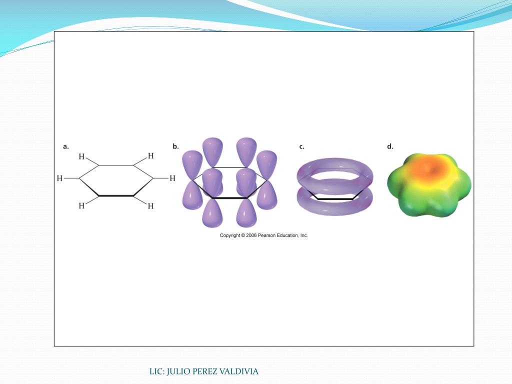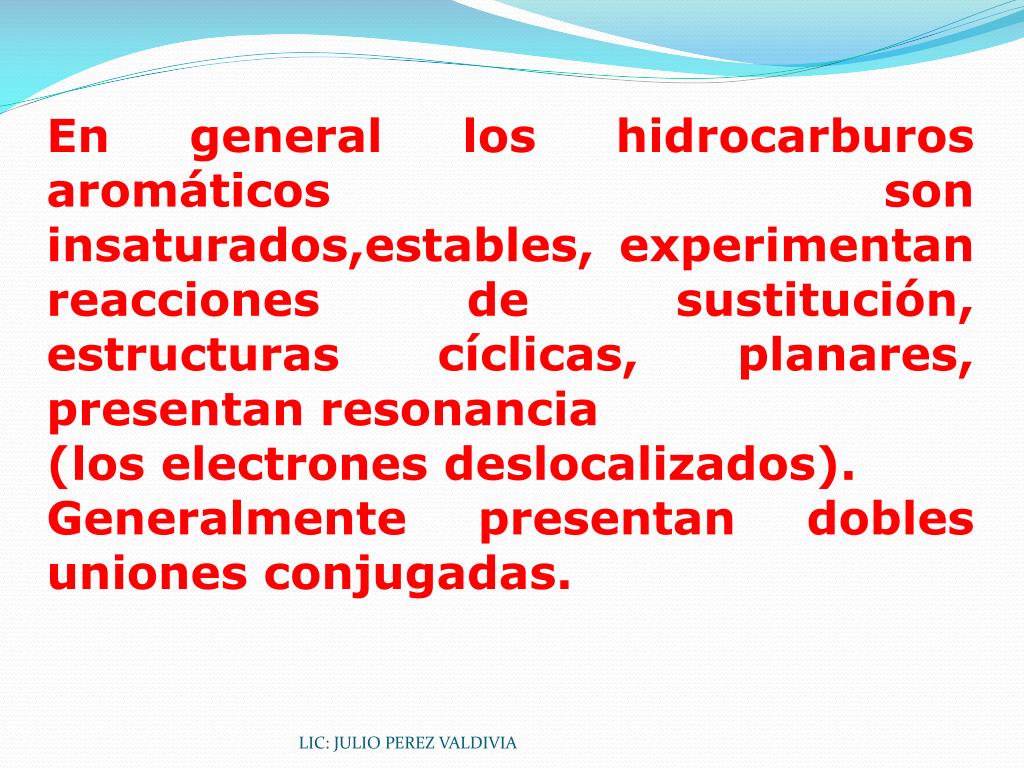 En general los hidrocarburos aromáticos son insaturados,estables, experimentan reacciones de sustitución, estructuras cíclicas, planares, presentan resonancia (los electrones deslocalizados). Generalmente presentan dobles uniones conjugadas. LIC: JULIO PEREZ VALDIVIA