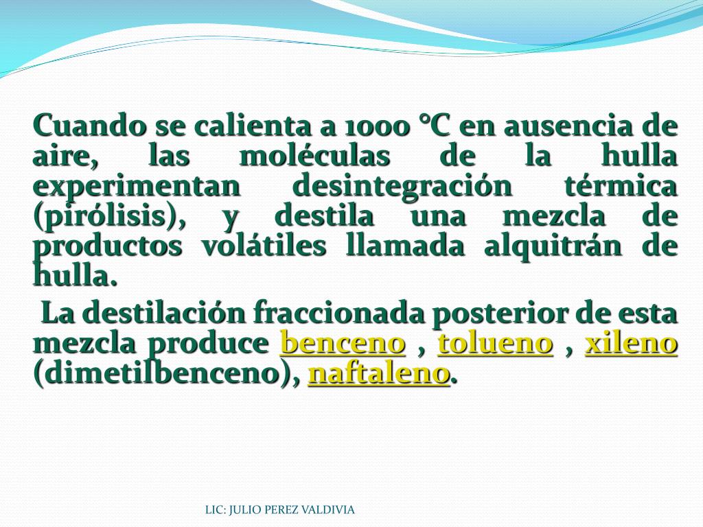 Cuando se calienta a 1000 °C en ausencia de aire, las moléculas de la hulla experimentan desintegración térmica (pirólisis), y destila una mezcla de productos volátiles llamada alquitrán de hulla. La destilación fraccionada posterior de esta mezcla produce benceno , tolueno , xileno (dimetilbenceno), naftaleno. LIC: JULIO PEREZ VALDIVIA
