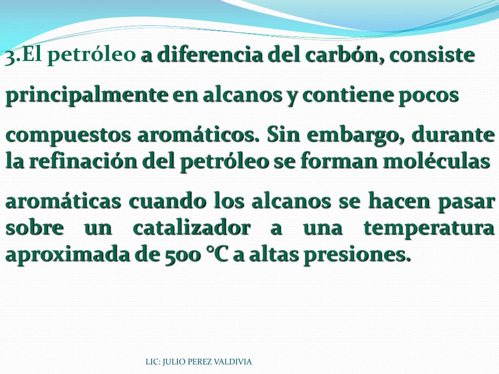 3.El petróleo a diferencia del carbón, consiste principalmente en alcanos y contiene pocos compuestos aromáticos. Sin embargo, durante la refinación del petróleo se forman moléculas aromáticas cuando los alcanos se hacen pasar sobre un catalizador a una temperatura aproximada de 500 °C a altas presiones. LIC: JULIO PEREZ VALDIVIA