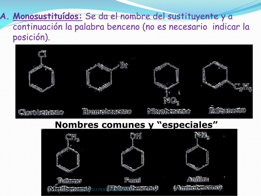 Monosustituídos: Se da el nombre del sustituyente y a continuación la palabra benceno (no es necesario indicar la posición). Nombres comunes y “especiales” LIC: JULIO PEREZ VALDIVIA