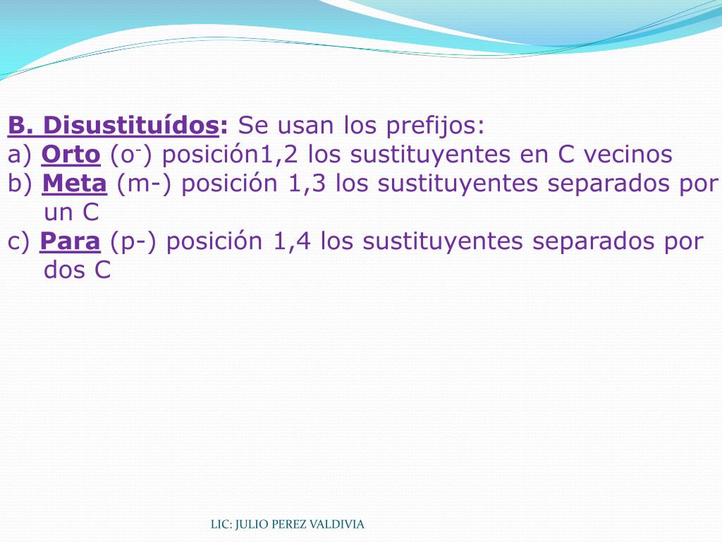 B. Disustituídos: Se usan los prefijos: a) Orto (o-) posición1,2 los sustituyentes en C vecinos b) Meta (m-) posición 1,3 los sustituyentes separados por un C c) Para (p-) posición 1,4 los sustituyentes separados por dos C LIC: JULIO PEREZ VALDIVIA
