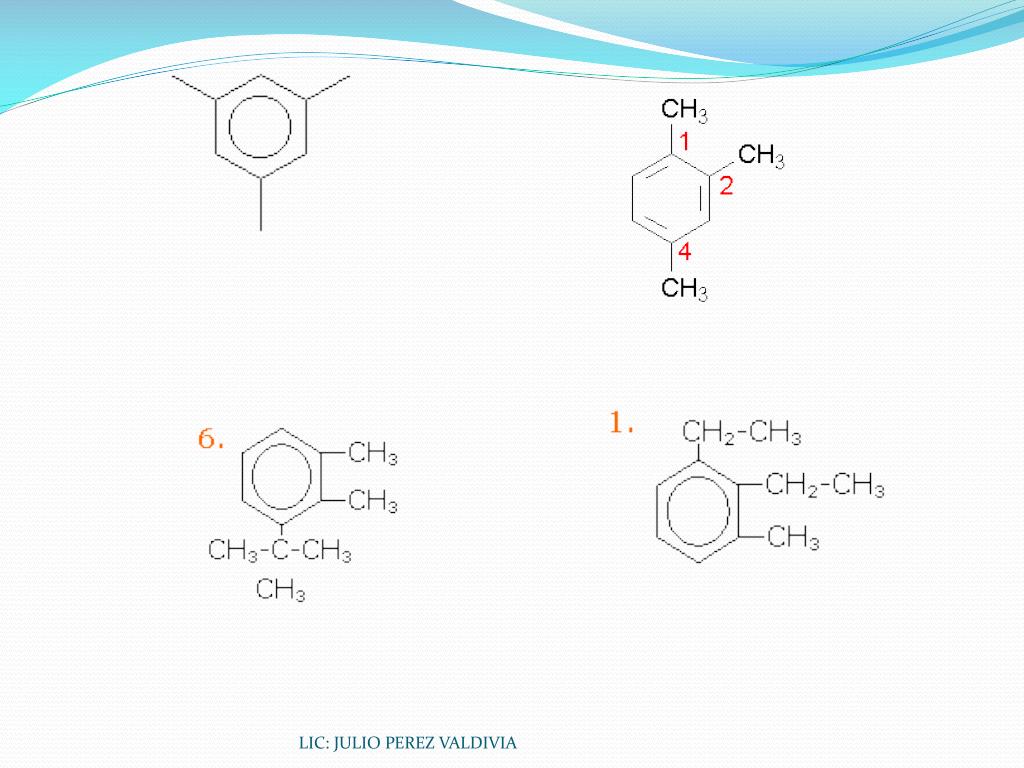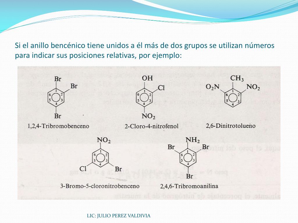 Si el anillo bencénico tiene unidos a él más de dos grupos se utilizan números para indicar sus posiciones relativas, por ejemplo: LIC: JULIO PEREZ VALDIVIA