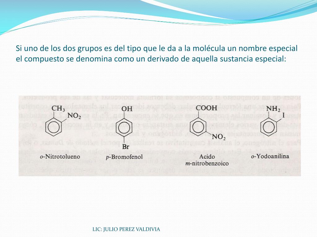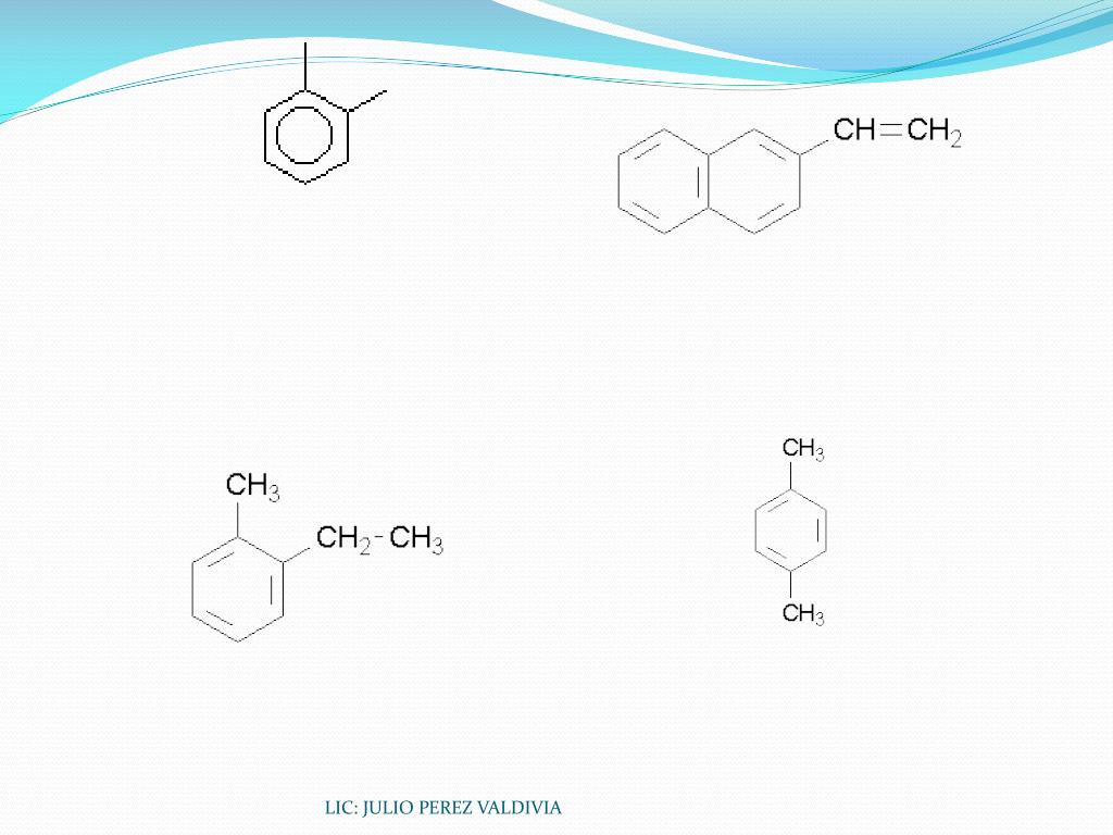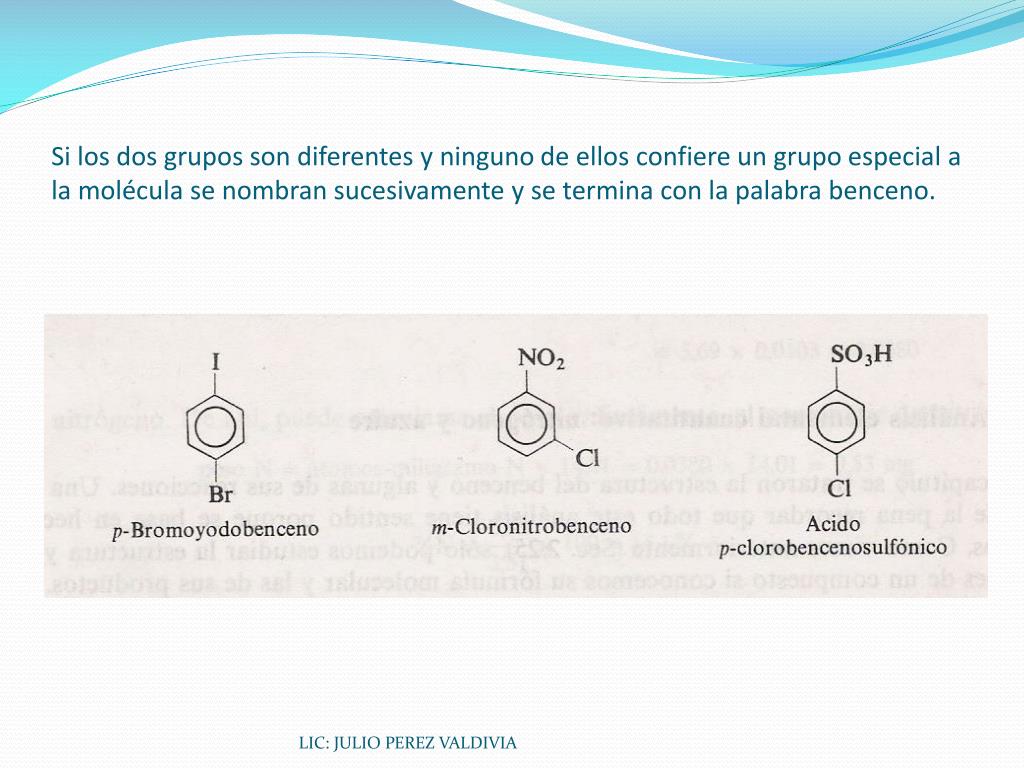 Si los dos grupos son diferentes y ninguno de ellos confiere un grupo especial a la molécula se nombran sucesivamente y se termina con la palabra benceno. LIC: JULIO PEREZ VALDIVIA