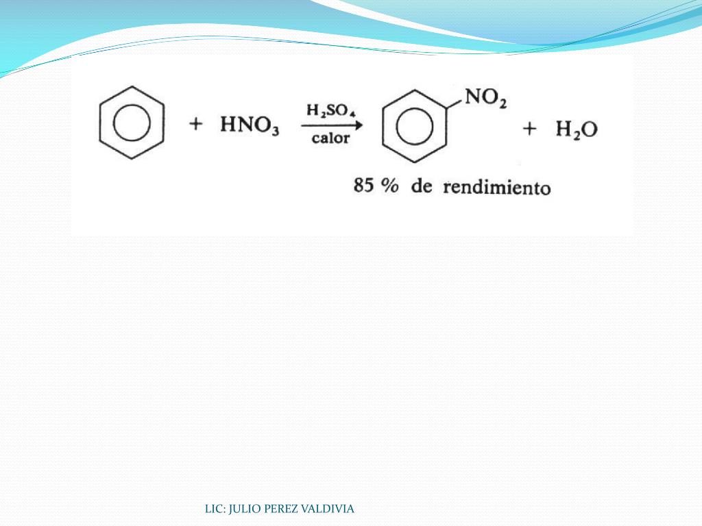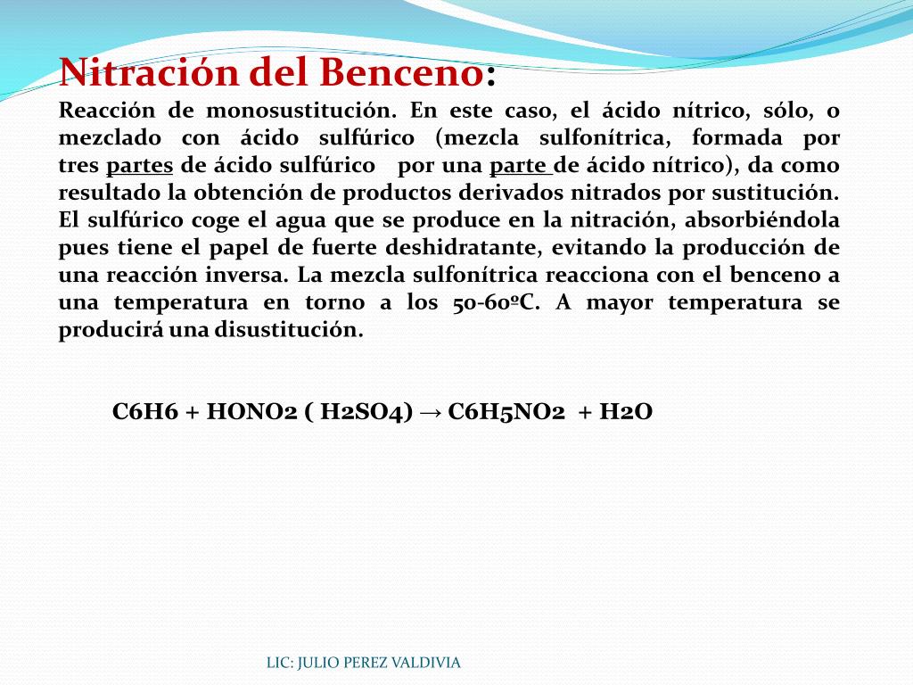 Nitración del Benceno: Reacción de monosustitución. En este caso, el ácido nítrico, sólo, o mezclado con ácido sulfúrico (mezcla sulfonítrica, formada por tres partes de ácido sulfúrico por una parte de ácido nítrico), da como resultado la obtención de productos derivados nitrados por sustitución. El sulfúrico coge el agua que se produce en la nitración, absorbiéndola pues tiene el papel de fuerte deshidratante, evitando la producción de una reacción inversa. La mezcla sulfonítrica reacciona con el benceno a una temperatura en torno a los 50-60ºC. A mayor temperatura se producirá una disustitución. C6H6 + HONO2 ( H2SO4) → C6H5NO2 + H2O LIC: JULIO PEREZ VALDIVIA