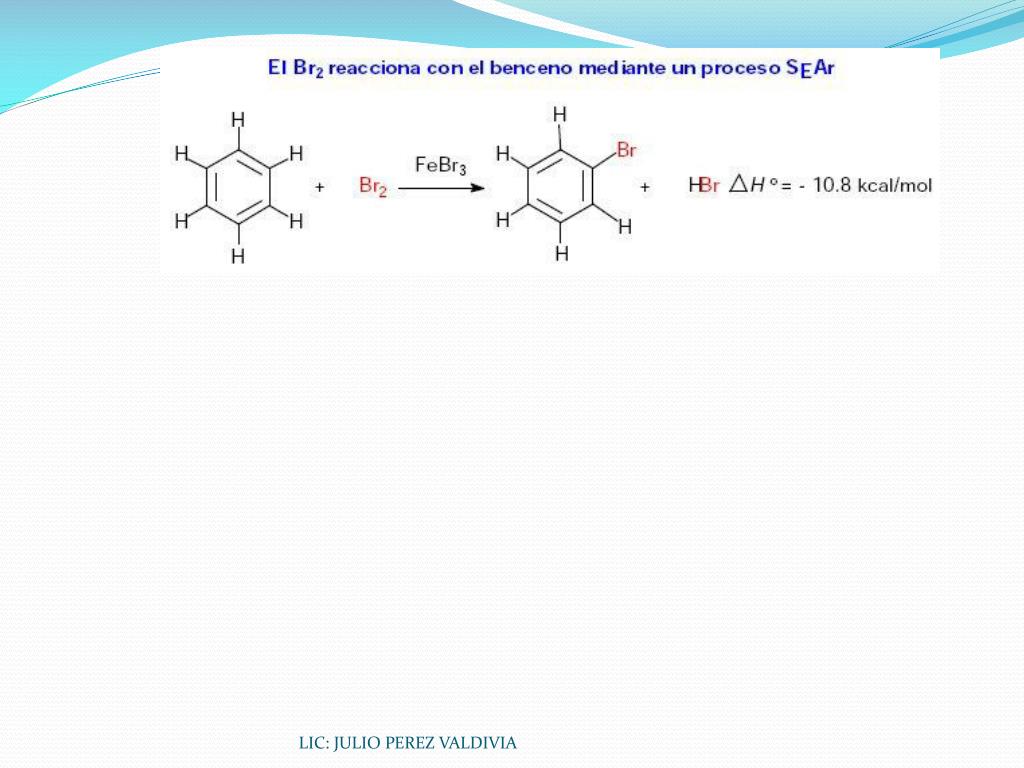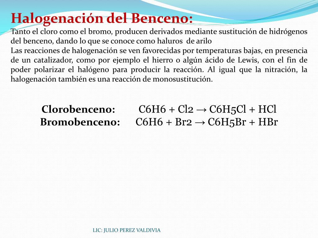 Halogenación del Benceno: Tanto el cloro como el bromo, producen derivados mediante sustitución de hidrógenos del benceno, dando lo que se conoce como haluros de arilo Las reacciones de halogenación se ven favorecidas por temperaturas bajas, en presencia de un catalizador, como por ejemplo el hierro o algún ácido de Lewis, con el fin de poder polarizar el halógeno para producir la reacción. Al igual que la nitración, la halogenación también es una reacción de monosustitución. Clorobenceno:C6H6 + Cl2 → C6H5Cl + HCl Bromobenceno:C6H6 + Br2 → C6H5Br + HBr LIC: JULIO PEREZ VALDIVIA