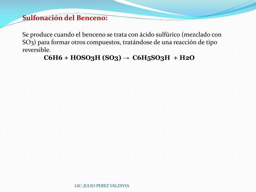 Sulfonación del Benceno: Se produce cuando el benceno se trata con ácido sulfúrico (mezclado con SO3) para formar otros compuestos, tratándose de una reacción de tipo reversible. C6H6 + HOSO3H (SO3) → C6H5SO3H + H2O LIC: JULIO PEREZ VALDIVIA