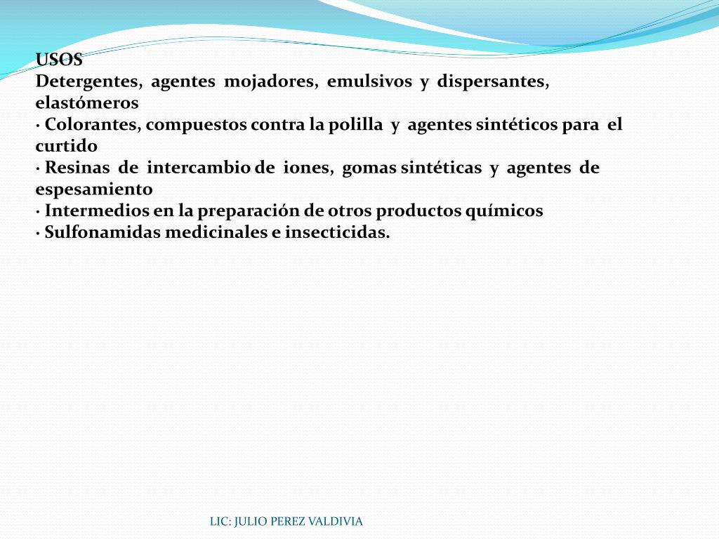 USOS Detergentes, agentes mojadores, emulsivos y dispersantes, elastómeros · Colorantes, compuestos contra la polilla y agentes sintéticos para el curtido · Resinas de intercambio de iones, gomas sintéticas y agentes de espesamiento · Intermedios en la preparación de otros productos químicos · Sulfonamidas medicinales e insecticidas. LIC: JULIO PEREZ VALDIVIA