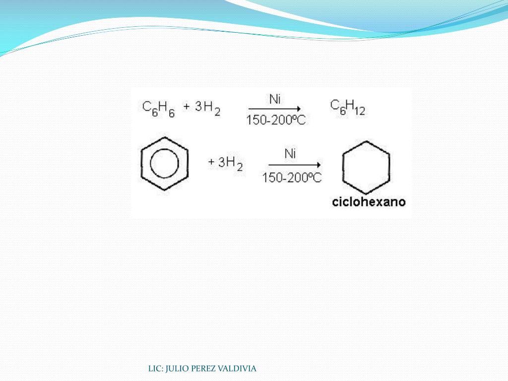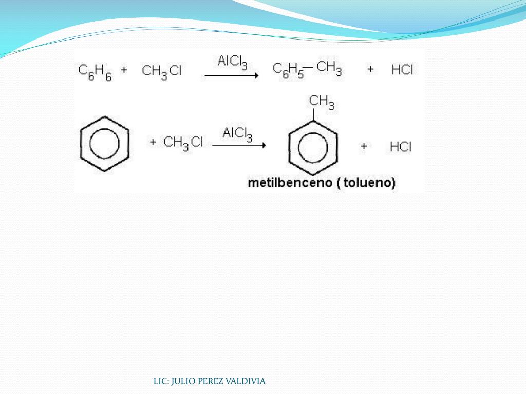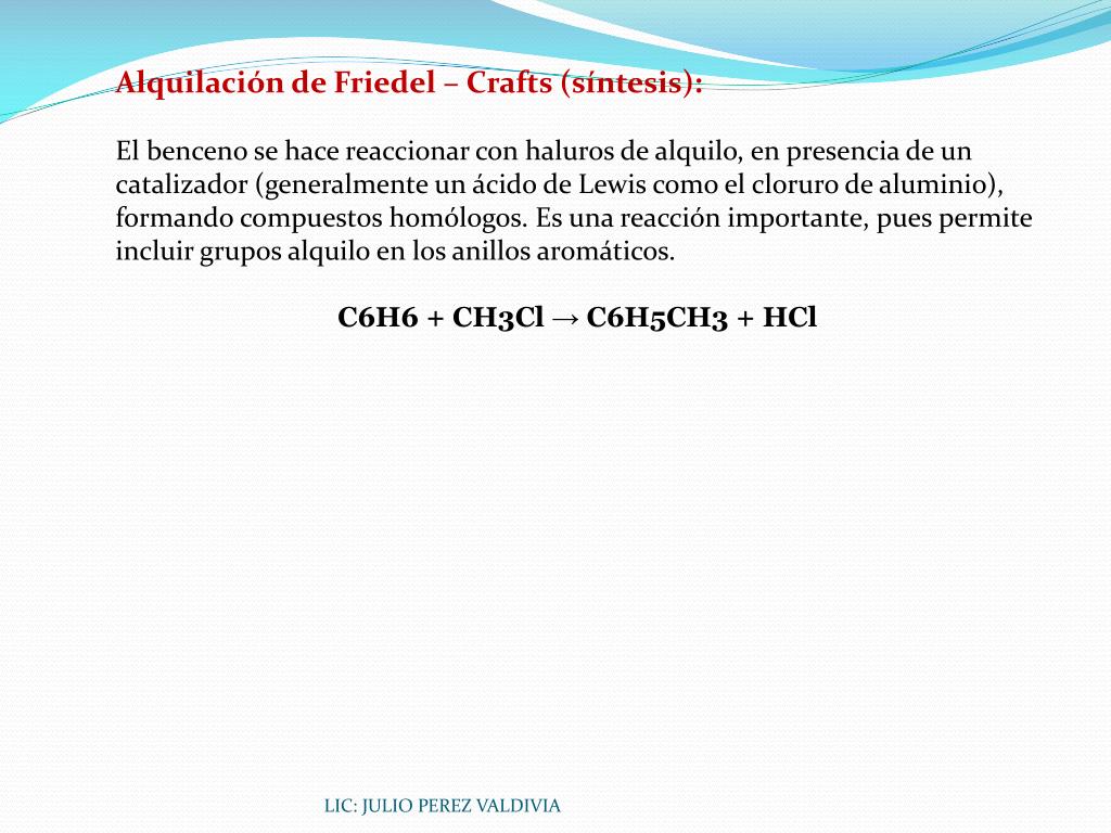 Alquilación de Friedel – Crafts (síntesis): El benceno se hace reaccionar con haluros de alquilo, en presencia de un catalizador (generalmente un ácido de Lewis como el cloruro de aluminio), formando compuestos homólogos. Es una reacción importante, pues permite incluir grupos alquilo en los anillos aromáticos. C6H6 + CH3Cl → C6H5CH3 + HCl LIC: JULIO PEREZ VALDIVIA