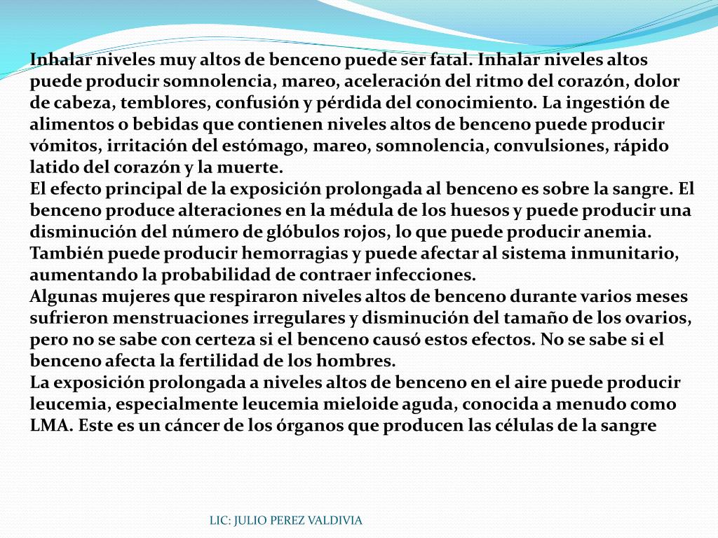 Inhalar niveles muy altos de benceno puede ser fatal. Inhalar niveles altos puede producir somnolencia, mareo, aceleración del ritmo del corazón, dolor de cabeza, temblores, confusión y pérdida del conocimiento. La ingestión de alimentos o bebidas que contienen niveles altos de benceno puede producir vómitos, irritación del estómago, mareo, somnolencia, convulsiones, rápido latido del corazón y la muerte. El efecto principal de la exposición prolongada al benceno es sobre la sangre. El benceno produce alteraciones en la médula de los huesos y puede producir una disminución del número de glóbulos rojos, lo que puede producir anemia. También puede producir hemorragias y puede afectar al sistema inmunitario, aumentando la probabilidad de contraer infecciones. Algunas mujeres que respiraron niveles altos de benceno durante varios meses sufrieron menstruaciones irregulares y disminución del tamaño de los ovarios, pero no se sabe con certeza si el benceno causó estos efectos. No se sabe si el benceno afecta la fertilidad de los hombres. La exposición prolongada a niveles altos de benceno en el aire puede producir leucemia, especialmente leucemia mieloide aguda, conocida a menudo como LMA. Este es un cáncer de los órganos que producen las células de la sangre LIC: JULIO PEREZ VALDIVIA