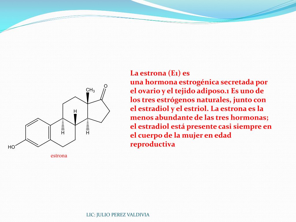 La estrona (E1) es una hormona estrogénica secretada por el ovario y el tejido adiposo.1 Es uno de los tres estrógenos naturales, junto con el estradiol y el estriol. La estrona es la menos abundante de las tres hormonas; el estradiol está presente casi siempre en el cuerpo de la mujer en edad reproductiva LIC: JULIO PEREZ VALDIVIA