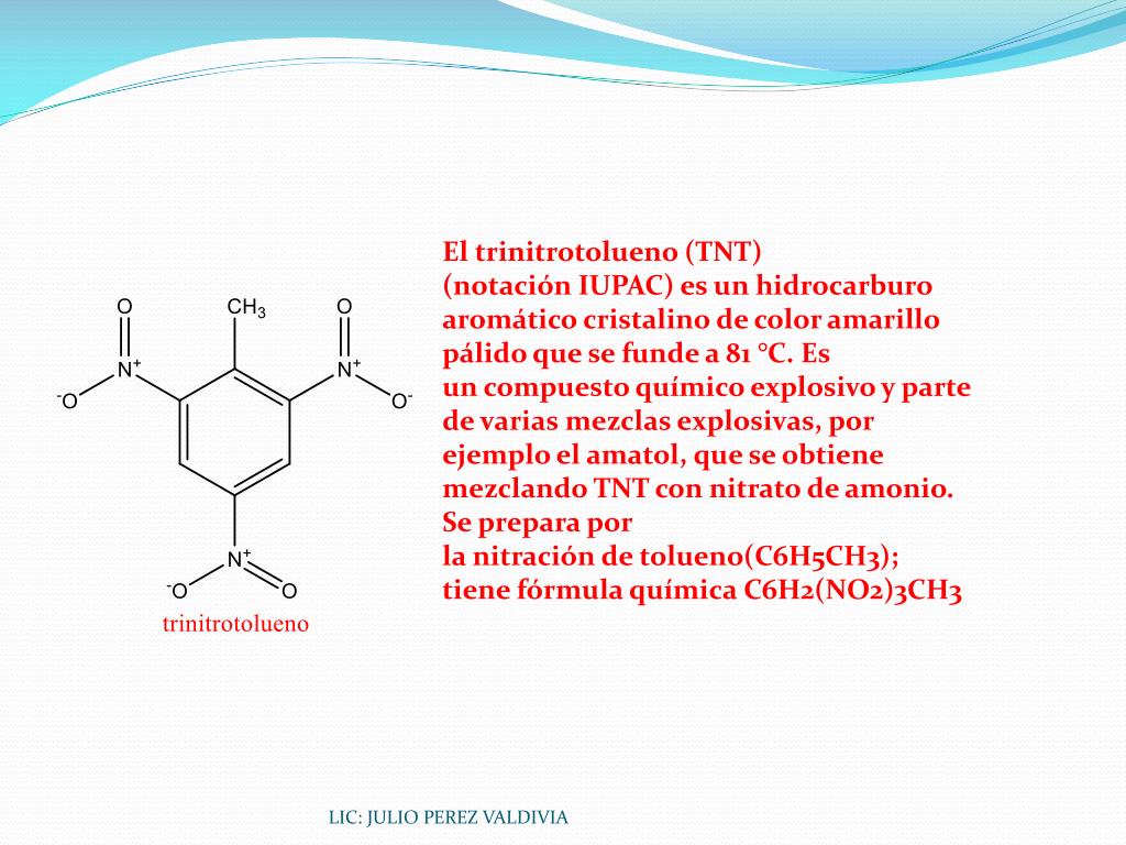 El trinitrotolueno (TNT) (notación IUPAC) es un hidrocarburo aromático cristalino de color amarillo pálido que se funde a 81 °C. Es un compuesto químico explosivo y parte de varias mezclas explosivas, por ejemplo el amatol, que se obtiene mezclando TNT con nitrato de amonio. Se prepara por la nitración de tolueno(C6H5CH3); tiene fórmula química C6H2(NO2)3CH3 LIC: JULIO PEREZ VALDIVIA