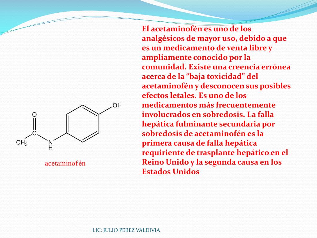 El acetaminofén es uno de los analgésicos de mayor uso, debido a que es un medicamento de venta libre y ampliamente conocido por la comunidad. Existe una creencia errónea acerca de la “baja toxicidad” del acetaminofén y desconocen sus posibles efectos letales. Es uno de los medicamentos más frecuentemente involucrados en sobredosis. La falla hepática fulminante secundaria por sobredosis de acetaminofén es la primera causa de falla hepática requiriente de trasplante hepático en el Reino Unido y la segunda causa en los Estados Unidos LIC: JULIO PEREZ VALDIVIA