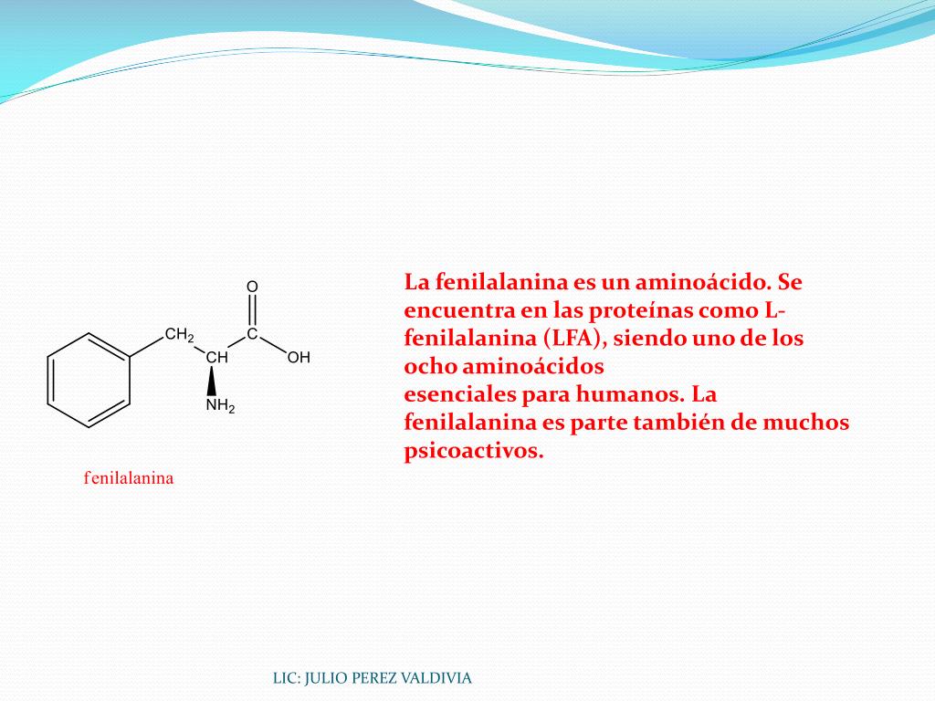 La fenilalanina es un aminoácido. Se encuentra en las proteínas como L-fenilalanina (LFA), siendo uno de los ocho aminoácidos esenciales para humanos. La fenilalanina es parte también de muchos psicoactivos. LIC: JULIO PEREZ VALDIVIA