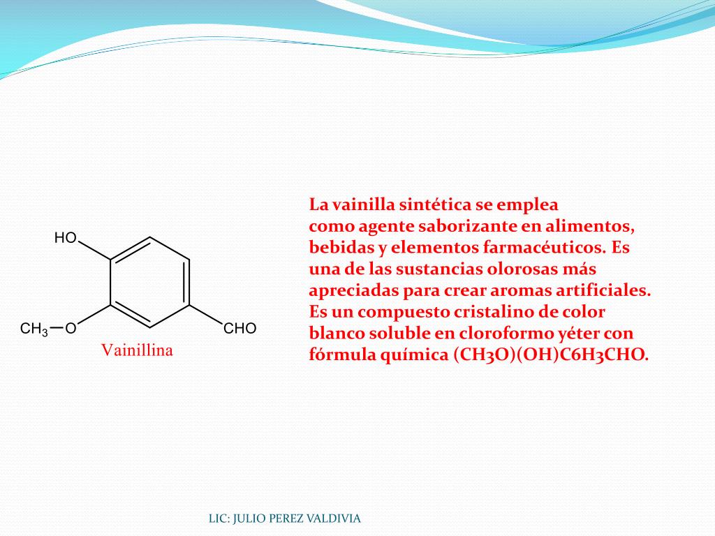 La vainilla sintética se emplea como agente saborizante en alimentos, bebidas y elementos farmacéuticos. Es una de las sustancias olorosas más apreciadas para crear aromas artificiales. Es un compuesto cristalino de color blanco soluble en cloroformo yéter con fórmula química (CH3O)(OH)C6H3CHO. LIC: JULIO PEREZ VALDIVIA