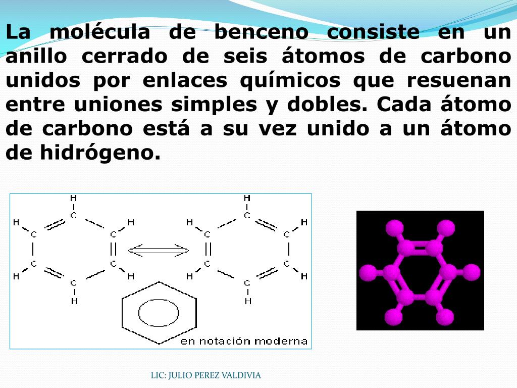 La molécula de benceno consiste en un anillo cerrado de seis átomos de carbono unidos por enlaces químicos que resuenan entre uniones simples y dobles. Cada átomo de carbono está a su vez unido a un átomo de hidrógeno. LIC: JULIO PEREZ VALDIVIA