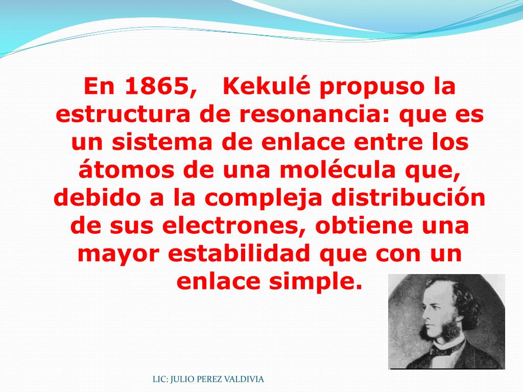 En 1865, Kekulé propuso la estructura de resonancia:que es un sistema de enlace entre los átomos de una molécula que, debido a la compleja distribución de sus electrones, obtiene una mayor estabilidad que con un enlace simple. LIC: JULIO PEREZ VALDIVIA