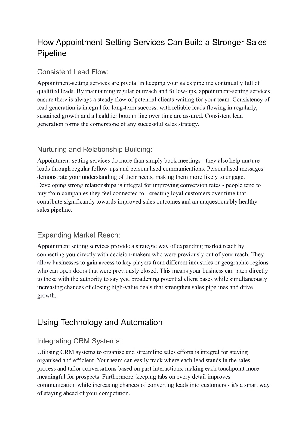 How Appointment-Setting Services Can Build a Stronger Sales Pipeline Consistent Lead Flow: Appointment-setting services are pivotal in keeping your sales pipeline continually full of qualified leads. By maintaining regular outreach and follow-ups, appointment-setting services ensure there is always a steady flow of potential clients waiting for your team. Consistency of lead generation is integral for long-term success: with reliable leads flowing in regularly, sustained growth and a healthier bottom line over time are assured. Consistent lead generation forms the cornerstone of any successful sales strategy. Nurturing and Relationship Building: Appointment-setting services do more than simply book meetings - they also help nurture leads through regular follow-ups and personalised communications. Personalised messages demonstrate your understanding of their needs, making them more likely to engage. Developing strong relationships is integral for improving conversion rates - people tend to buy from companies they feel connected to - creating loyal customers over time that contribute significantly towards improved sales outcomes and an unquestionably healthy sales pipeline. Expanding Market Reach: Appointment setting services provide a strategic way of expanding market reach by connecting you directly with decision-makers who were previously out of your reach. They allow businesses to gain access to key players from different industries or geographic regions who can open doors that were previously closed. This means your business can pitch directly to those with the authority to say yes, broadening potential client bases while simultaneously increasing chances of closing high-value deals that strengthen sales pipelines and drive growth. Using Technology and Automation Integrating CRM Systems: Utilising CRM systems to organise and streamline sales efforts is integral for staying organised and efficient. Your team can easily track where each lead stands in the sales process and tailor conversations based on past interactions, making each touchpoint more meaningful for prospects. Furthermore, keeping tabs on every detail improves communication while increasing chances of converting leads into customers - it's a smart way of staying ahead of your competition.
