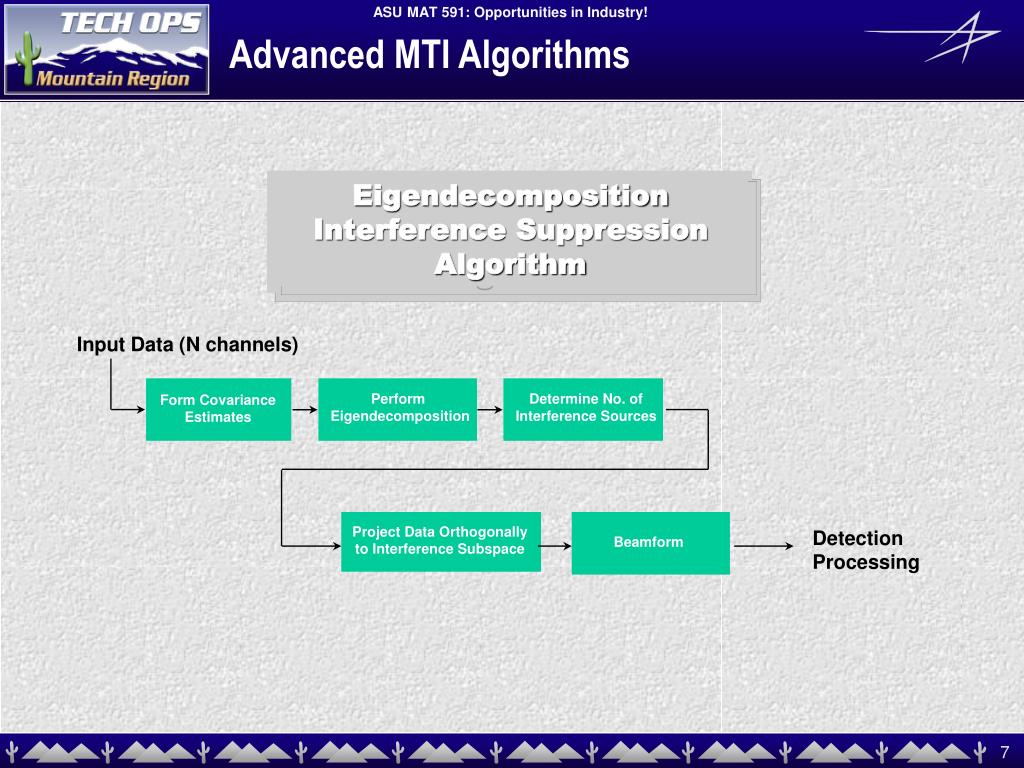 Eigendecomposition Interference SuppressionAlgorithm Advanced MTI Algorithms Input Data (N channels) Perform Eigendecomposition Determine No. of Interference Sources Form Covariance Estimates Project Data Orthogonally to Interference Subspace Detection Processing Beamform
