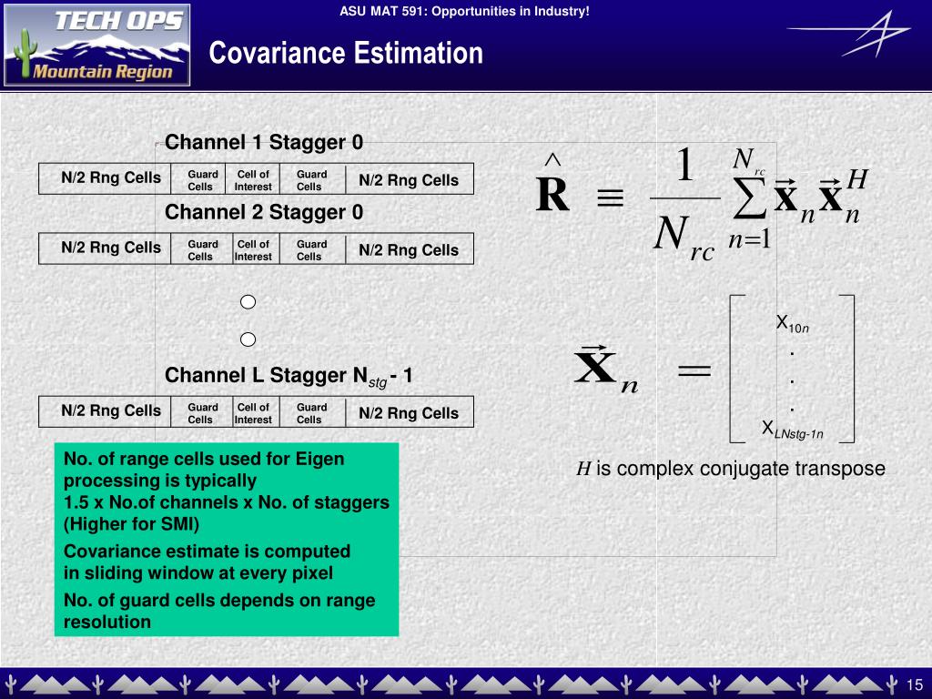 Covariance Estimation Channel 1 Stagger 0 N/2 Rng Cells Guard Cells Cell of Interest Guard Cells N/2 Rng Cells Channel 2 Stagger 0 N/2 Rng Cells Guard Cells Cell of Interest Guard Cells N/2 Rng Cells X10n . . . XLNstg-1n Channel L Stagger Nstg - 1 N/2 Rng Cells Guard Cells Cell of Interest Guard Cells N/2 Rng Cells No. of range cells used for Eigen processing is typically 1.5 x No.of channels x No. of staggers (Higher for SMI) Covariance estimate is computed in sliding window at every pixel No. of guard cells depends on range resolution His complex conjugate transpose