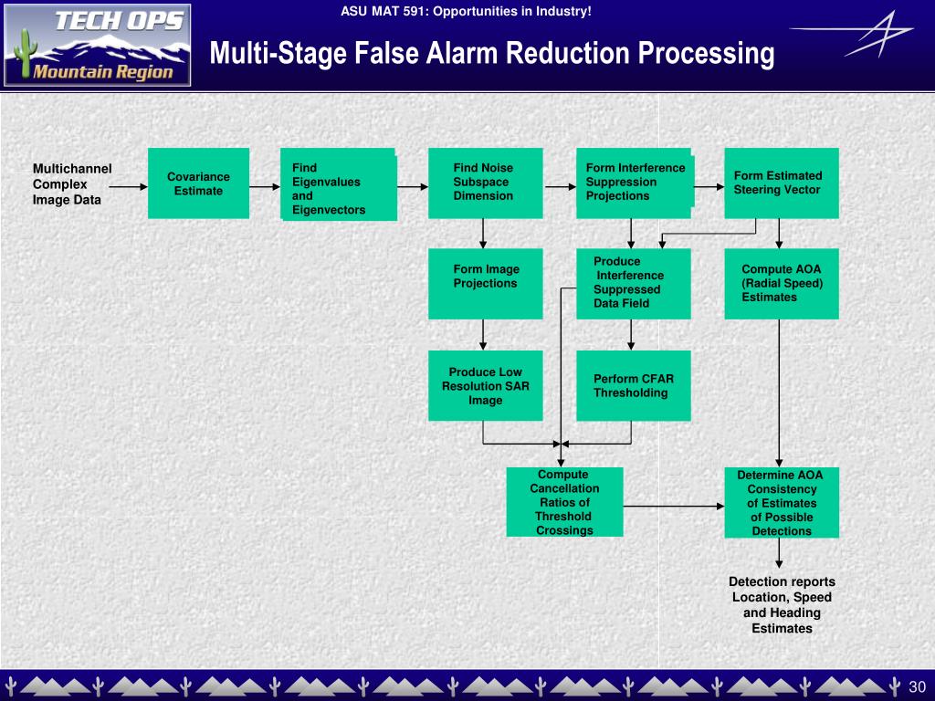 Multi-Stage False Alarm Reduction Processing Covariance Estimate Multichannel Complex Image Data Find Eigenvalues and Eigenvectors Find Noise Subspace Dimension Form Interference Suppression Projections Form Estimated Steering Vector Produce Interference Suppressed Data Field Form Image Projections Compute AOA (Radial Speed) Estimates Produce Low Resolution SAR Image Perform CFAR Thresholding Compute Cancellation Ratios of Threshold Crossings Determine AOA Consistency of Estimates of Possible Detections Detection reports Location, Speed and Heading Estimates